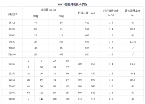 TD\TH型提升機為目前應用較廣泛的兩款提升機,TD型采用掏取式裝料,離心式卸料。特點:適用粉狀、粒狀和小塊狀的低磨琢性物料,斗型有Q型(淺斗)、H型(弧底斗)、zd型、中深斗sd型(深斗)四種。TH型采用掏取式裝料,重力或混合式卸料,適用于1.51tm3的物料,斗型在zh型(淺斗)和sh(深斗)兩種。